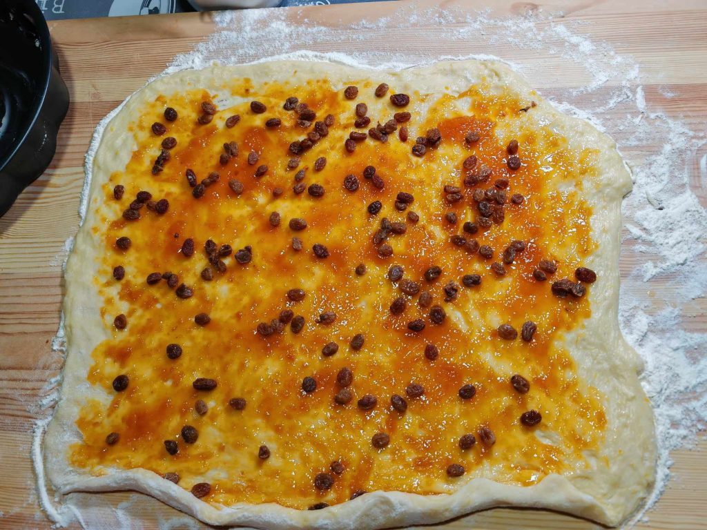 • Étalez maintenant la surface avec de la confiture d’abricots, puis ajoutez les amandes effilées et les raisins secs.