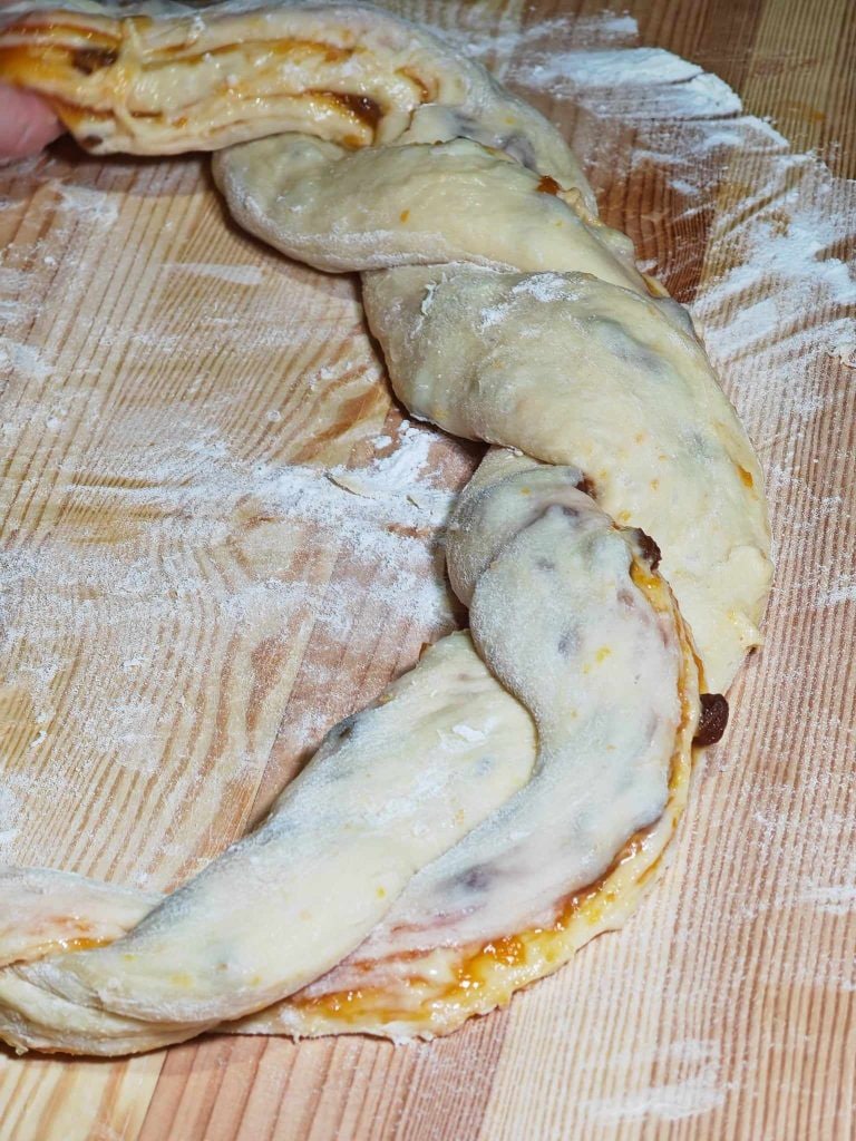 Ouvrez les deux moitiés avec le côté coupé vers le haut (pour obtenir l’effet feuilleté) et torsadez les deux boudins, comme une tresse, sans trop serrer.