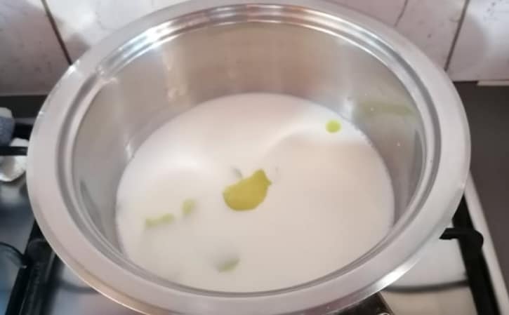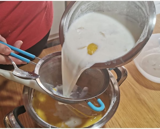 • Détrempez le mélange avec un peu de lait versé en filet en faisant attention, pour éviter que le zeste de citron tombe dans la crème, utilisez une passoire, après avoir incorporé tout le lait, remettez sur feu modéré.