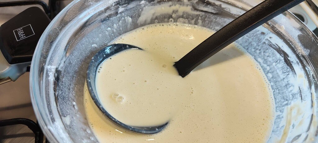 Délayez le mélange en ajoutant progressivement le lait tout en continuant de mélanger jusqu’à obtenir une pâte fluide et sans grumeaux.