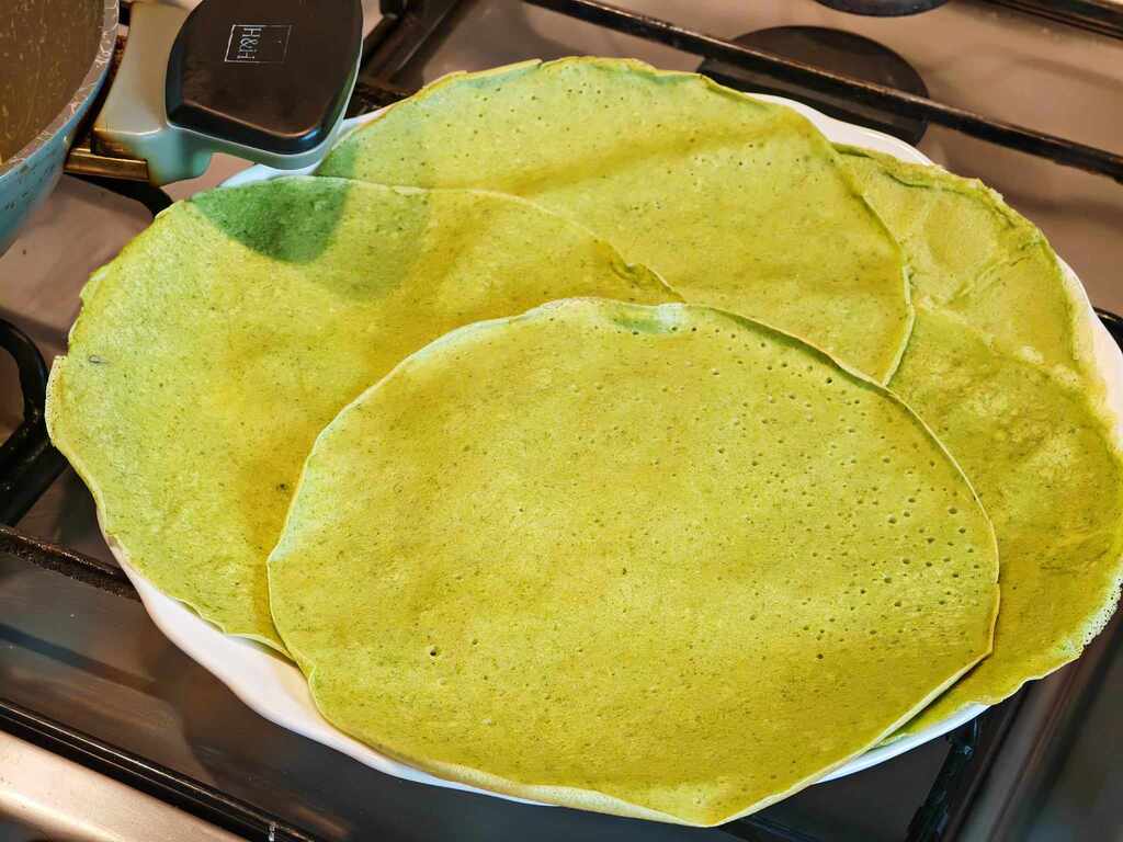 Pour maintenir sa couleur vive, passez-le dans de l’eau glacée et égouttez, puis mettez de côté.Égouttez-les très bien et divisez-les en deux parties, une pour préparer les crêpes et une pour la farce.
