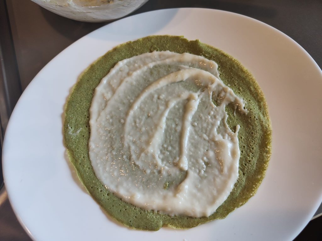 Nous étalons une bonne cuillère de farce sur chacune des crêpes.