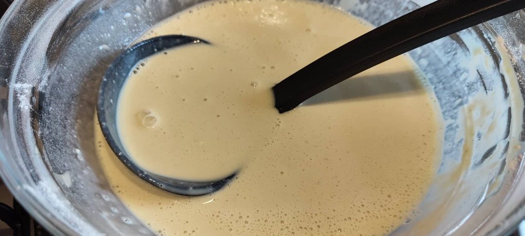 • Délayez le mélange en ajoutant peu à peu le lait et continuez à mélanger jusqu’à obtenir une pâte fluide et sans aucun grumeau.