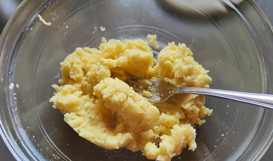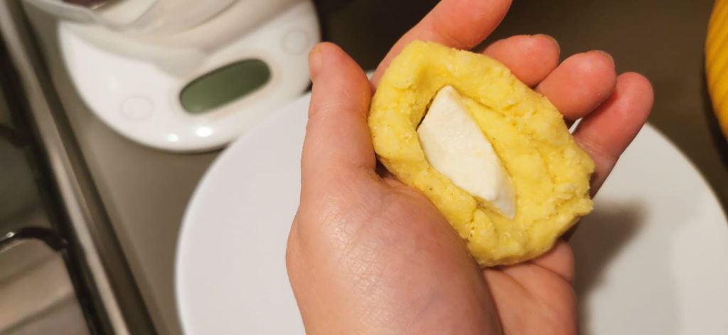 Dans un petit bol à part, battez les jaunes d’œufs avec du poivre et du sel, puis ajoutez-les à la purée de pommes de terre aromatisée avec de la noix de muscade râpée et assaisonnée avec les fromages râpés, mélangez avec une cuillère pour amalgamer les ingrédients jusqu’à obtenir une pâte douce et sèche.