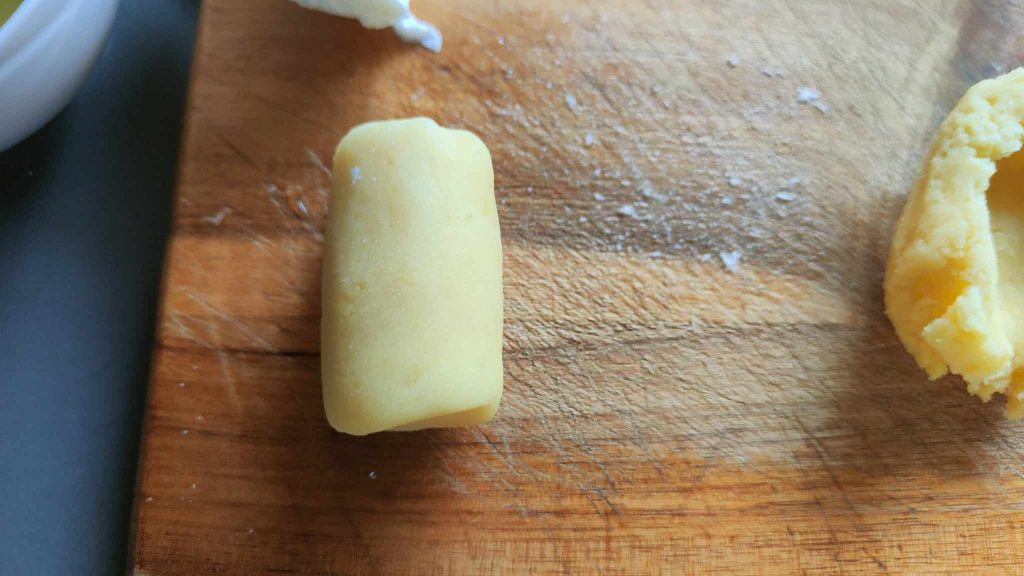 Dans la pâte, j’ai incorporé deux cuillères à soupe de fécule de pommes de terre qui nous aideront à éliminer l’humidité des pommes de terre et à compacter la purée. Ajustez seulement après avoir bien mélangé le tout.