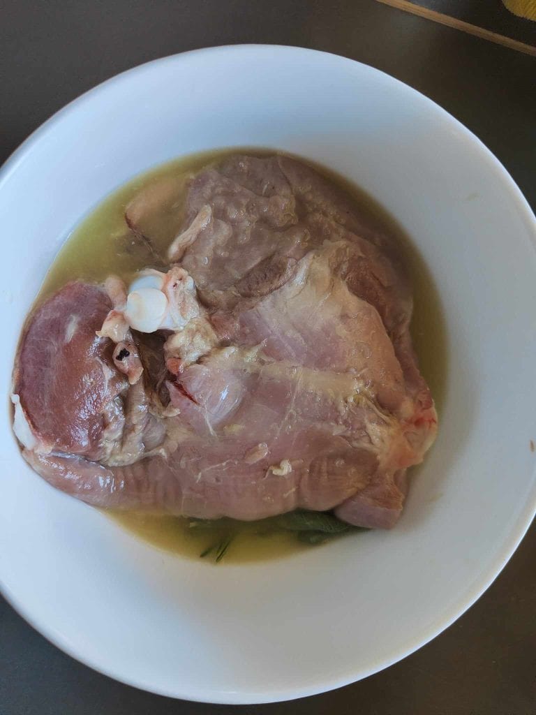 - 2 cuisses de dinde, crues (poids de chaque cuisse 500 g)