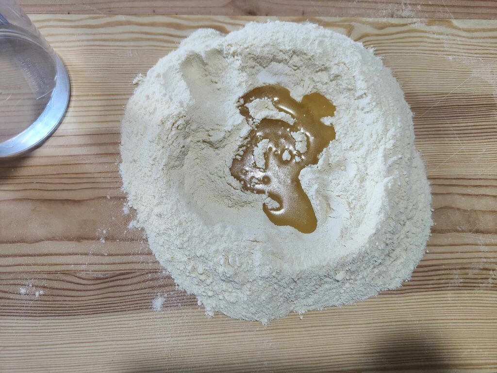 Pour la pâte, mélanger les farines avec une pincée de sel, de l’eau et quelques cuillères à soupe d’huile d’olive extra vierge.