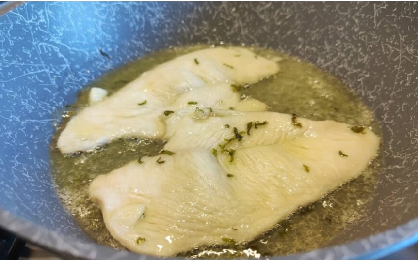 Ajoutez le blanc de dinde fariné et faites-le dorer à feu moyen en le retournant pour le cuire uniformément des deux côtés jusqu’à ce qu’il soit doré.