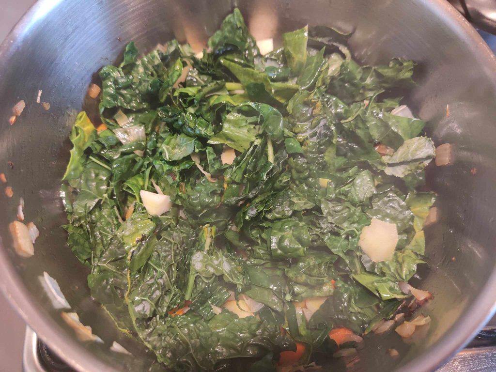 Nettoyez les feuilles de chou noir en retirant la tige centrale dure des feuilles, lavez et coupez finement.Ajoutez-le à l’émincé.