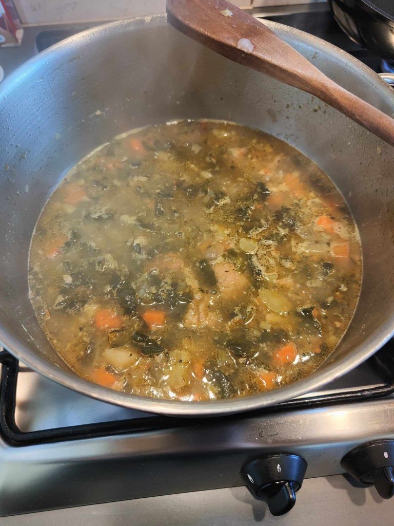 Je vous propose ma version, celle qui plaît chez moi, il suffit de tourner un coin et elle change déjà de nom. Incavolata, à cause du chou noir dans la région de la Versilia, mais aussi polenta incatenata, intruglia, ou bordatino livornese.