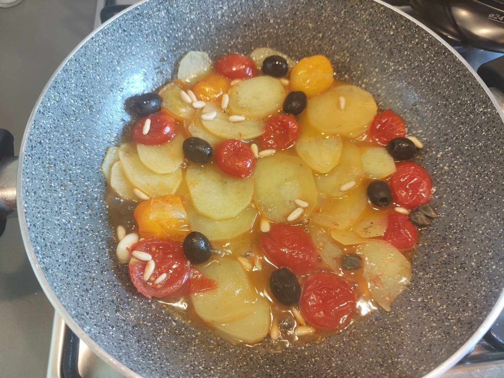 Dès que les tomates libèrent leur eau, ajoutez la pomme de terre coupée en lamelles pour ramollir le tout pendant quelques minutes.