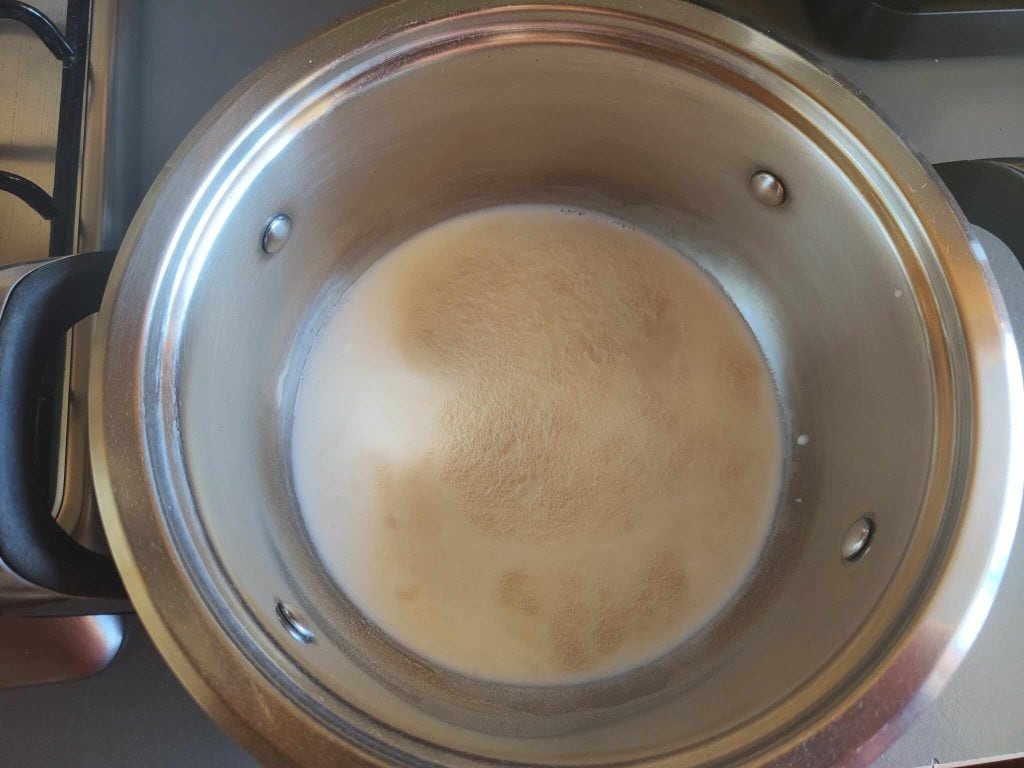 Versez le lait dans une casserole, ajoutez l’agar en poudre, bien mélanger et chauffer à feu doux.