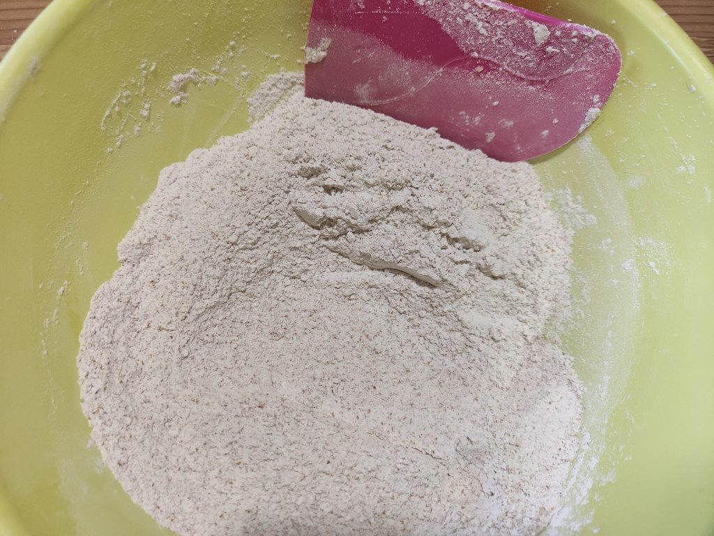 Dans un grand bol, mettons la farine complète, la levure de bière, les deux cuillères à café de sucre et mélangeons le tout à la main.