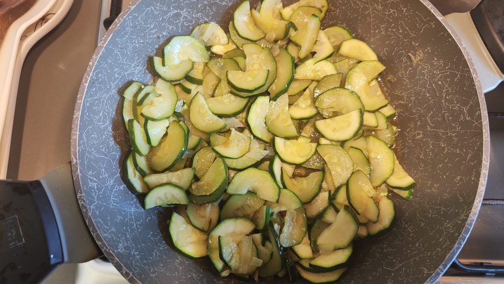 Prenez une poêle, faites dorer un peu d’oignon coupé en tranches avec un peu d’huile d’olive, puis ajoutez les courgettes, salez et faites-les cuire.