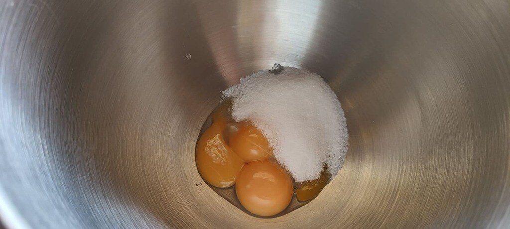 Dans le bol du robot pâtissier, battre les œufs entiers à température ambiante avec le sucre et l’extrait de vanille jusqu’à obtenir un mélange clair et mousseux.