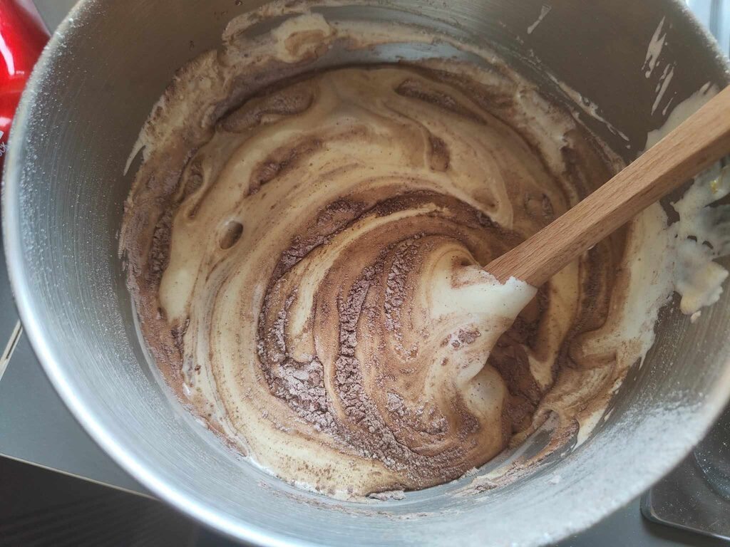 Maintenant, avec une spatule, mélanger la farine et le cacao tamisés avec la levure et une pincée de sel.