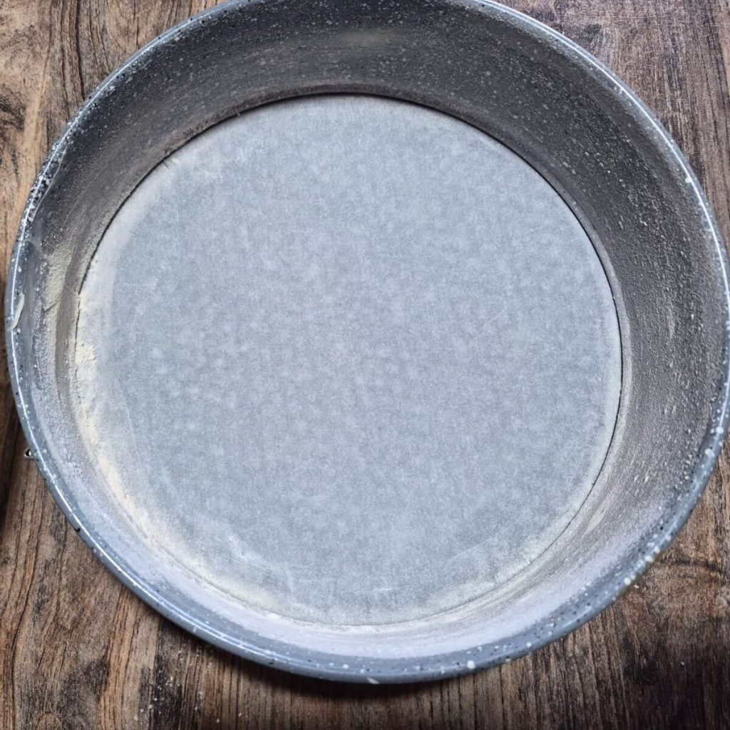 Ensuite, préparez le moule de 24/26 cm avec charnière au fond, mettez le papier sulfurisé pendant que les côtés doivent être beurrés et farinés