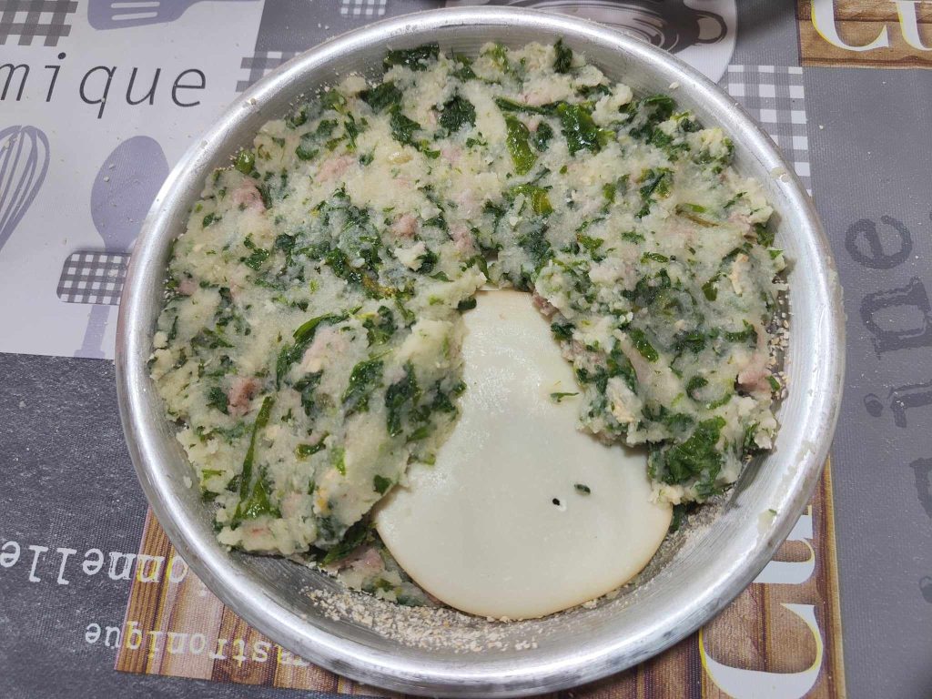 • Disposez maintenant les tranches de provola et couvrez toute la surface avec le mélange restant.