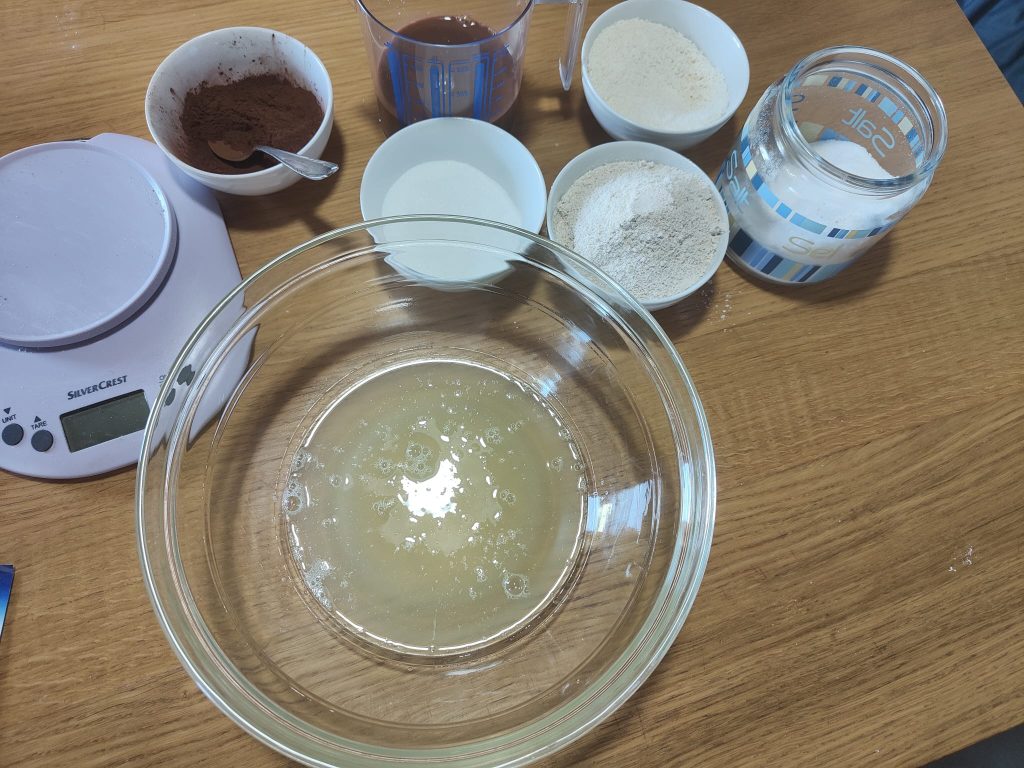 • Ajoutez les farines, la levure, le cacao, le lait de soja au chocolat et le chocolat fondu et mélangez à nouveau avec le fouet.