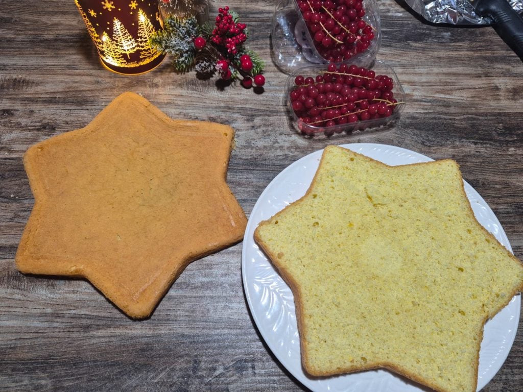 J’ai préparé un moelleux Biscuit de Savoie cuit dans un moule en forme d’étoile, généreusement garni de ma délicieuse Crème Paradiso (à base de mascarpone, crème fraîche et sucre glace).