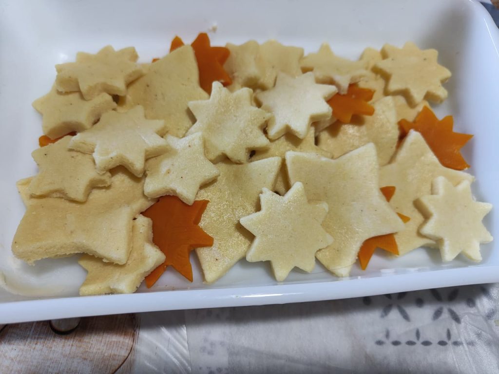 (Entre-temps, j’ai pelé un morceau de courge coupé en fines tranches de 0,5 cm et j’en ai fait des étoiles.