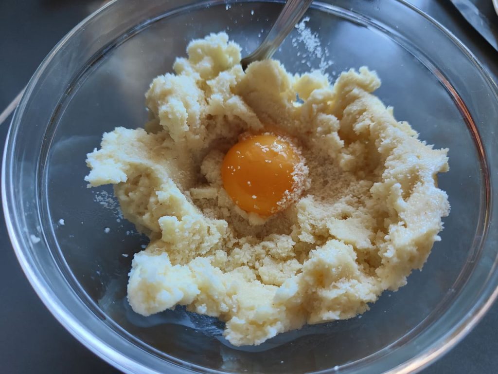Hors du feu, laissez légèrement tiédir, ajoutez le fromage râpé et les deux jaunes d’œufs.