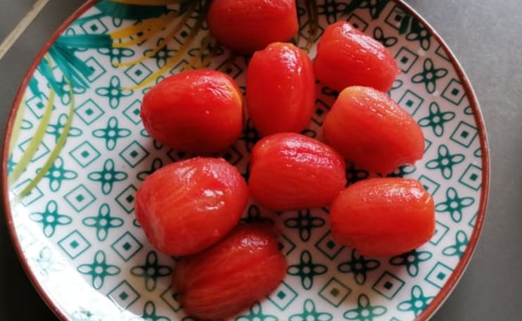 Mettre sur le feu une petite casserole pleine d’eau, à ébullition plonger les tomates cerises et les laisser quelques minutes, les égoutter et les refroidir en les passant à l’eau froide, de cette manière il est plus facile de les peler.