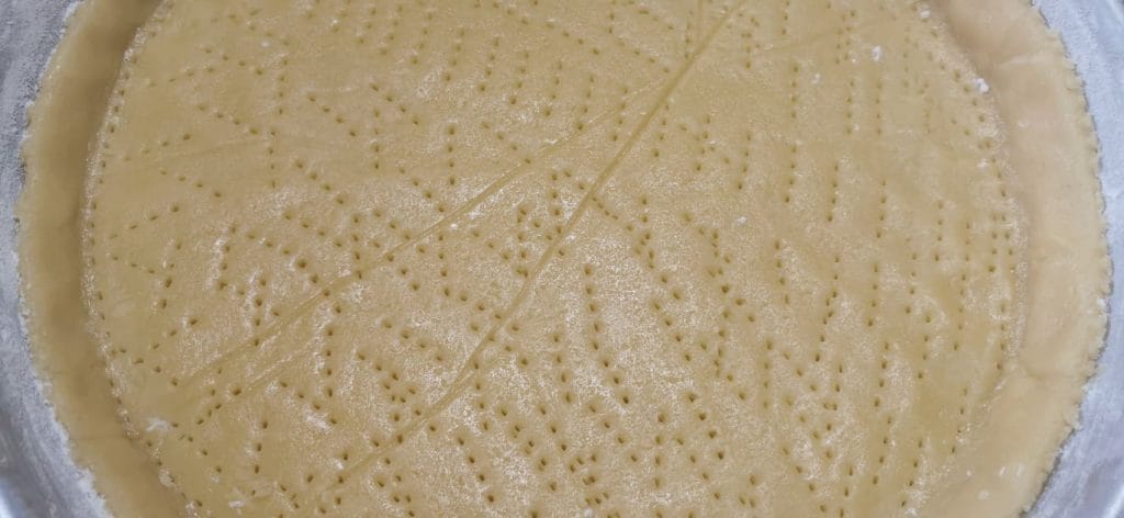 Divisez la pâte sablée en deux parties, une plus grande pour faire la base et une partie qui servira à faire les bandes pour la décoration.