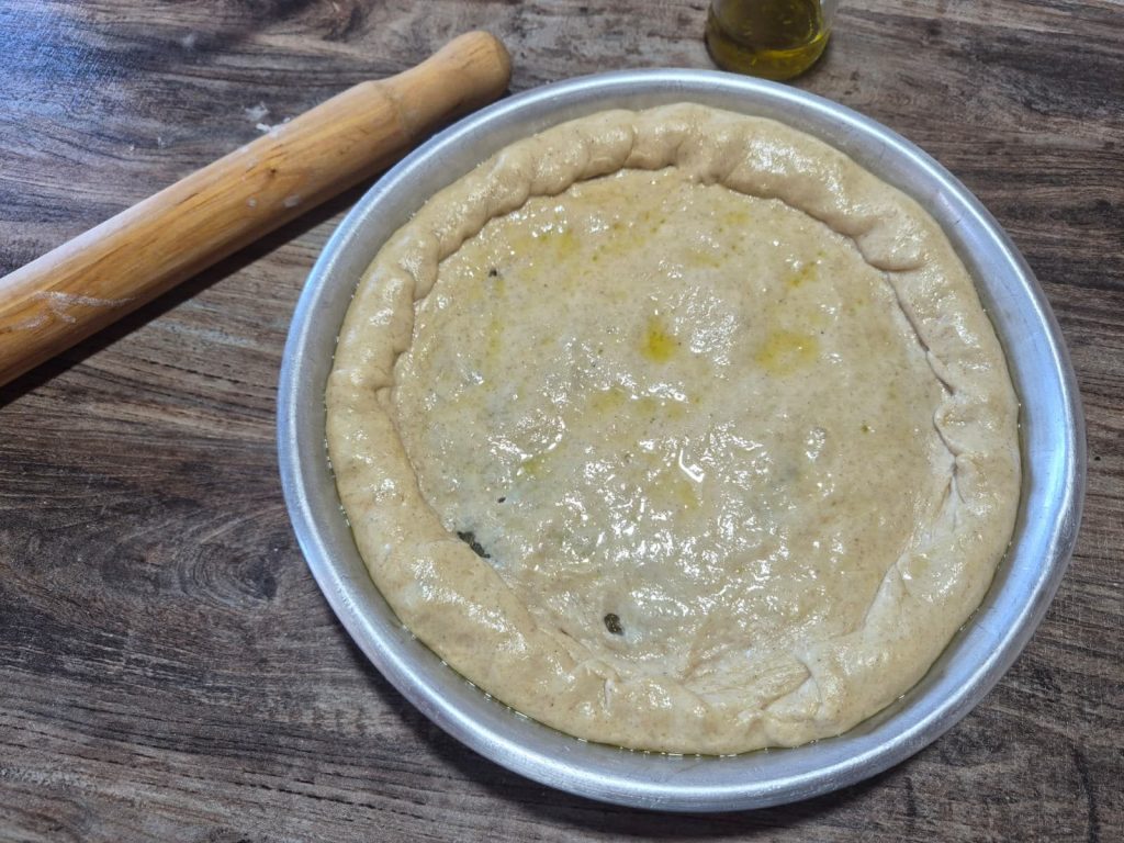 Transférer la feuille de pizza dans une plaque d’environ 26-28 centimètres de diamètre, préalablement huilée avec de l’huile d’olive.