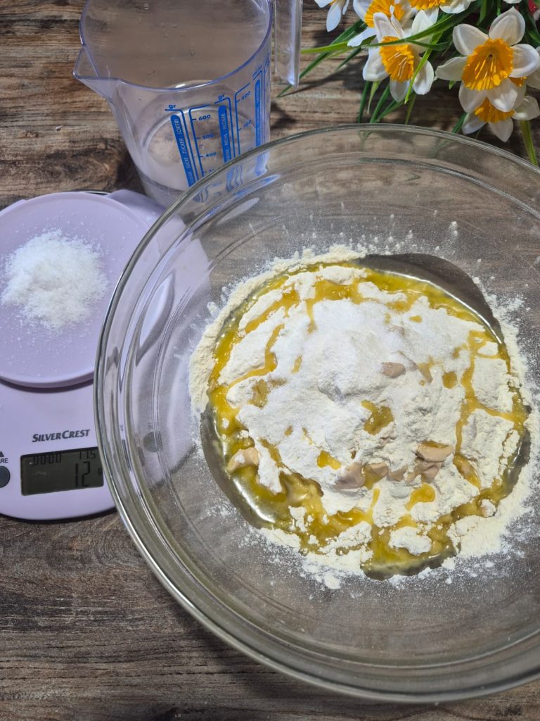 (Si vous utilisez la farine intégrale de type 2, il pourrait être nécessaire d’ajouter un peu plus d’eau, environ 20ml, versez avec prudence).