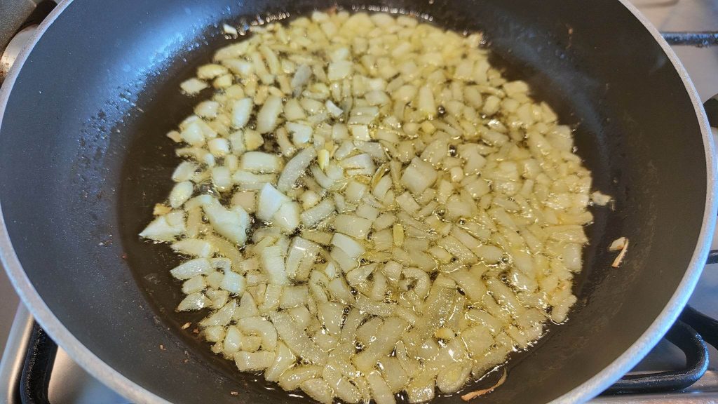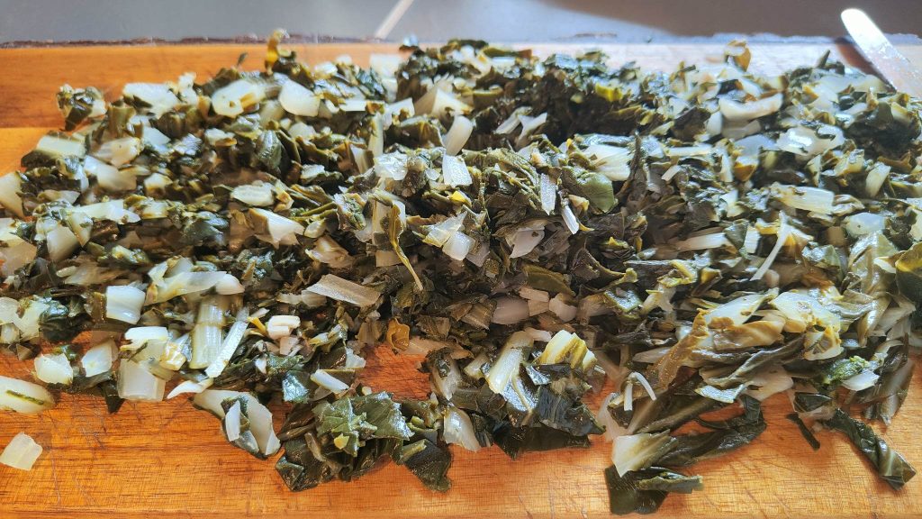 Couper l’oignon en fines tranches et le faire revenir dans une poêle avec un peu d’huile, ajouter les bettes et les faire revenir pendant quelques minutes.
