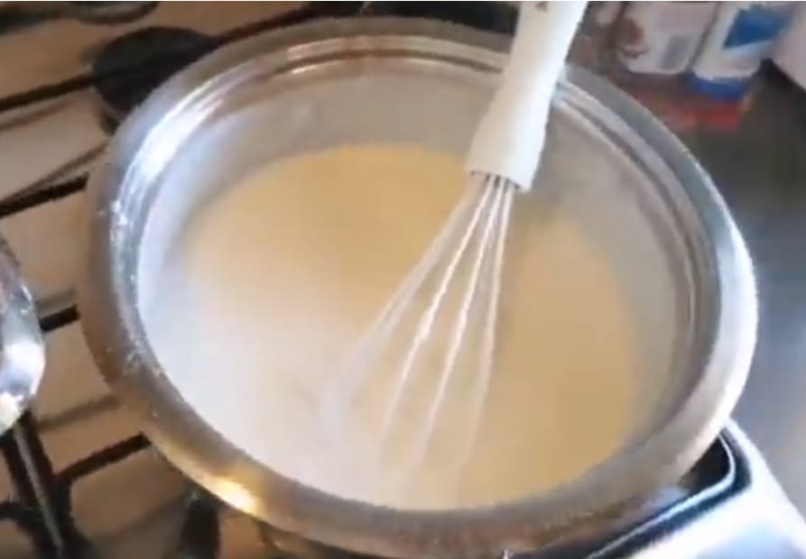 Remettez la casserole sur le feu et continuez à mélanger jusqu’à ce que le mélange commence à prendre une légère couleur dorée, incorporez le lait chaud et mélangez énergiquement le tout avec le fouet.