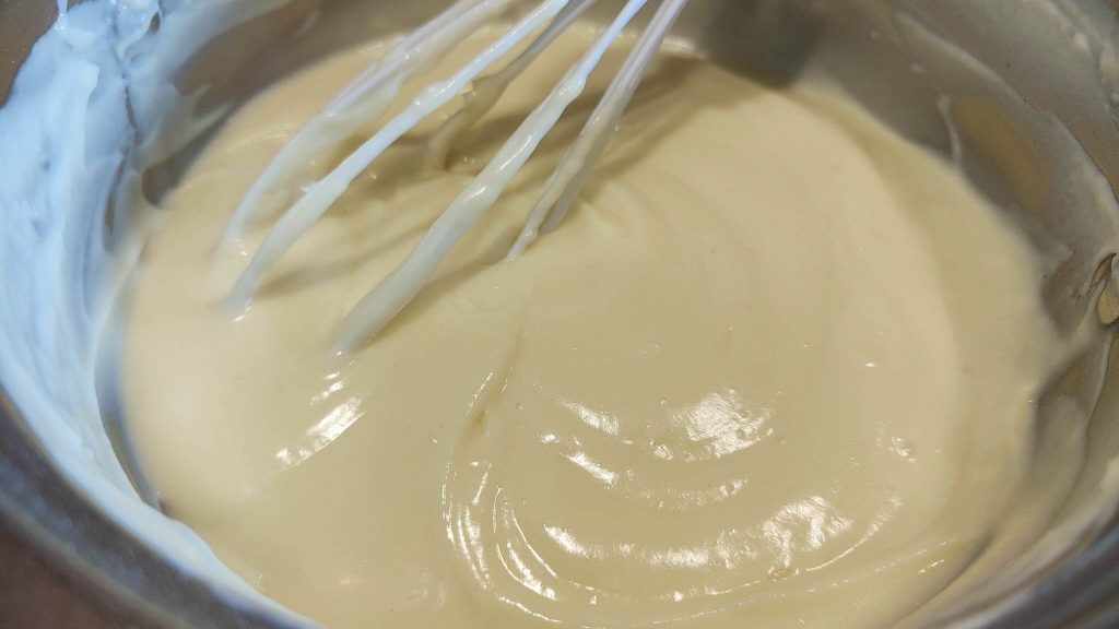 Une fois que la crème pâtissière est bien froide, prenez-la et allégissez-la en y incorporant délicatement la crème fouettée avec une spatule, en mélangeant avec des mouvements lents de bas en haut.