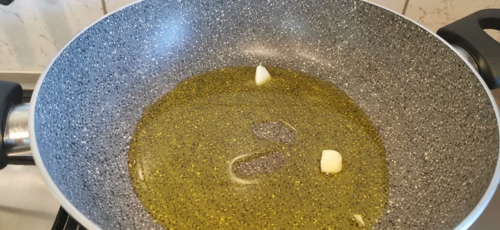 • Chauffer un peu d’huile dans une grande poêle et y faire blondir une gousse d’ail.