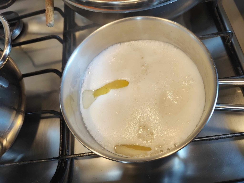 • Verser dans une casserole le lait, l’eau, l’huile de graines, le zeste de citron et d’orange, faire bouillir pendant quelques minutes. Retirer toutes les écorces et ajouter une pincée de sel.