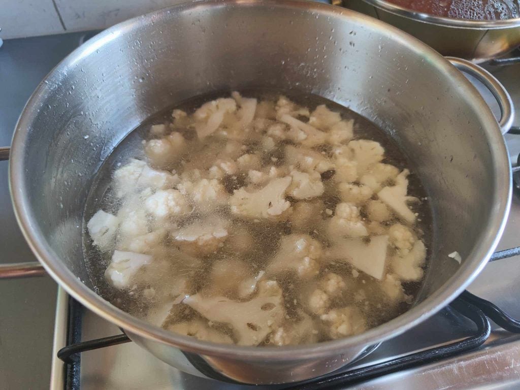 Faire revenir une gousse d’ail et un piment dans l’huile, puis ajouter le chou-fleur coupé en fleurons et laisser aromatiser quelques minutes