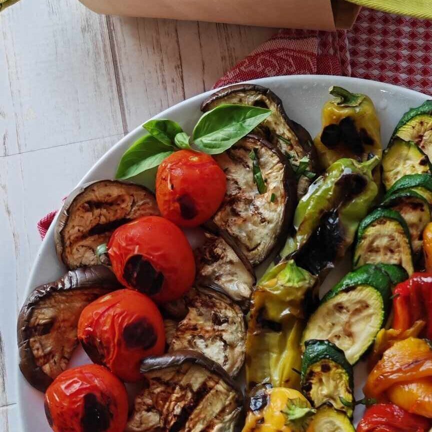 Placez les légumes grillés sur un grand plat de service, saupoudrez-les du mélange aromatique et arrosez-les d’huile d’olive extra vierge.