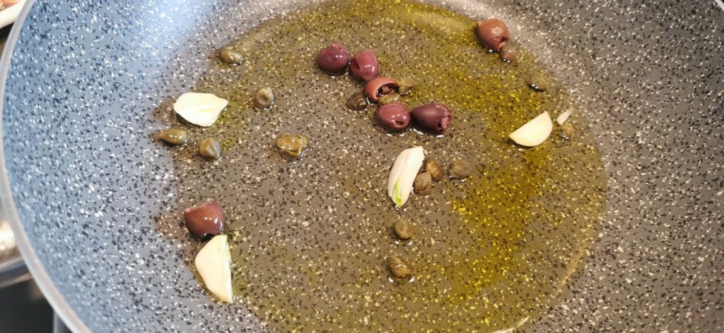 En attendant, prenez une poêle antiadhésive et faites revenir un filet d’huile d’olive avec une gousse d’ail.