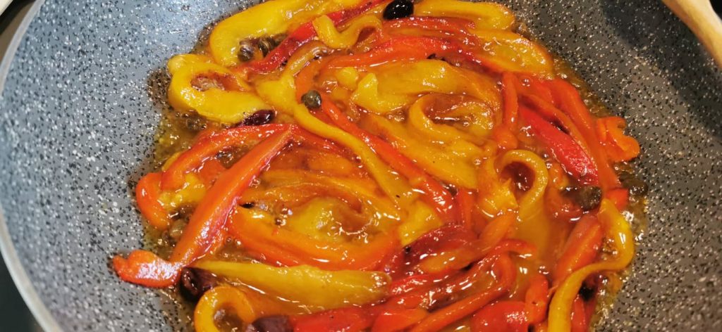 Une fois qu’ils sont ramollis , nettoyez les poivrons en coupant la partie supérieure des poivrons, retirez les graines et les filaments blancs et épluchez-les en les passant sous l’eau courante, réduisez-les en lanières et mettez-les de côté).