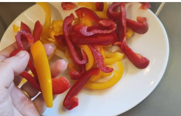 Nettoyez les poivrons en retirant la partie centrale et toutes les graines et coupez-les en lanières d’environ 5 centimètres.