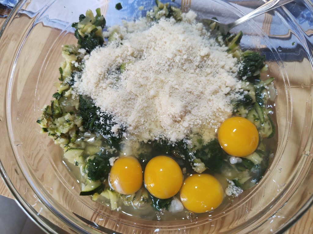 Mélangez-les bien avec les pommes de terre et salez au goût. Ajoutez les œufs, le parmesan et râpez un peu de noix de muscade.