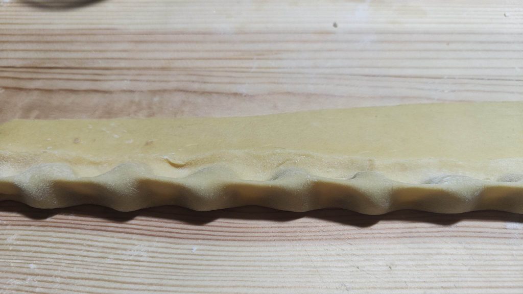 Avec une roulette à pâte dentelée, éliminez l’excédent de pâte sur toute la longueur et enfin pincez avec les doigts la pâte entre les farces pour former les agnolotti.