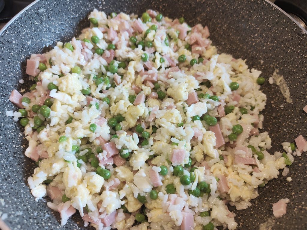 Quand les œufs commencent à s’épaissir légèrement, ajoutez les pois, le jambon cuit, mélangez et enfin ajoutez le riz.