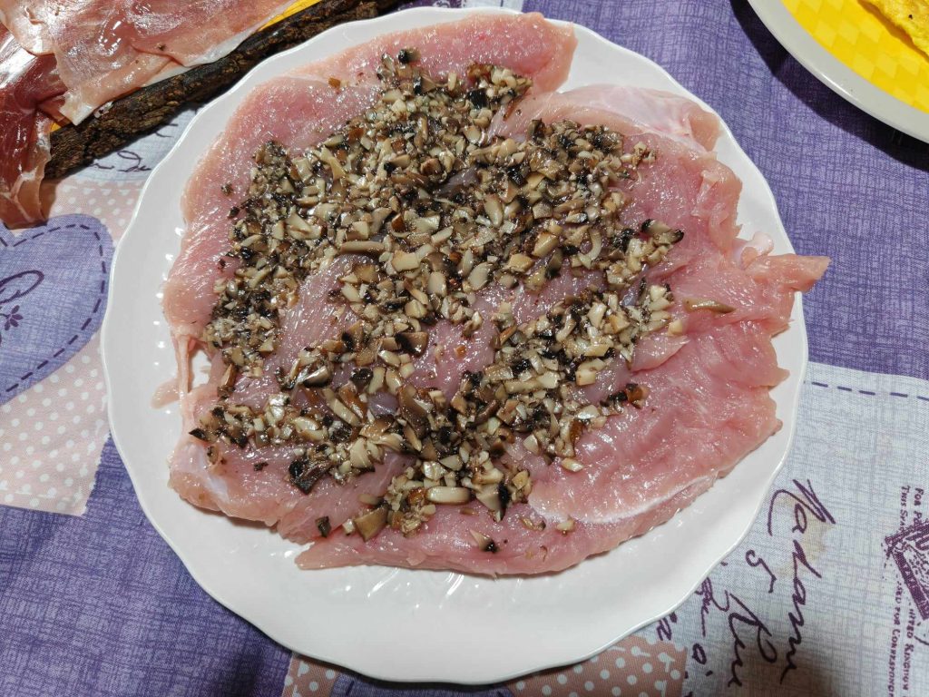 • Disposez dessus les champignons et le jambon cru, veillant à laisser quelques centimètres tout autour de la dinde.