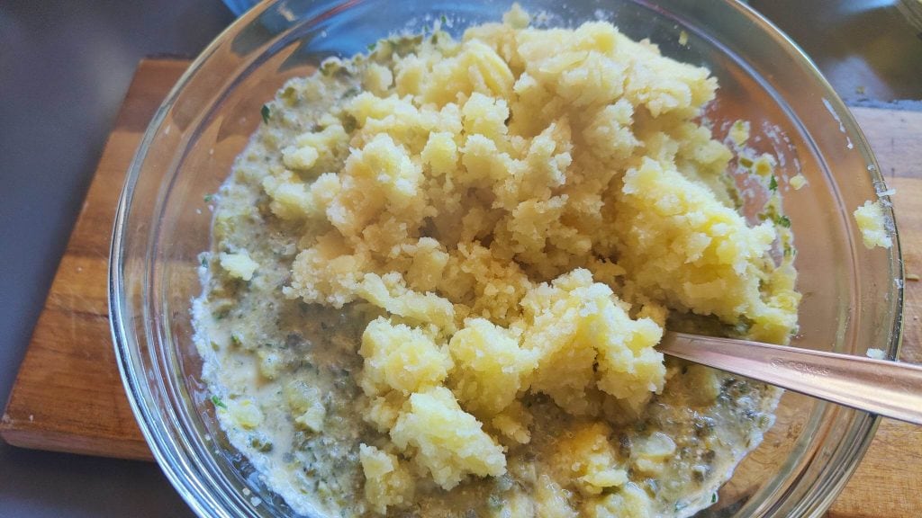 Incorporez au mélange les haricots verts et les pommes de terre, en mélangeant bien jusqu’à obtenir une pâte homogène.