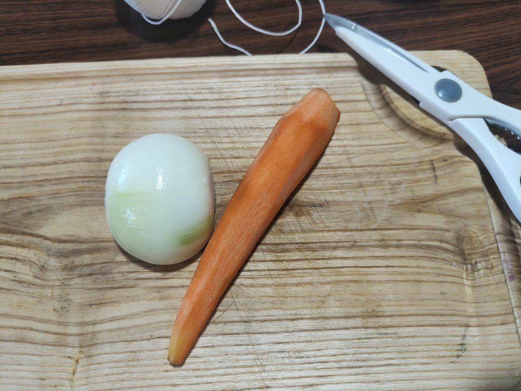 Préparez ensuite le hachis aromatique en hachant finement le céleri, la carotte et l’oignon.