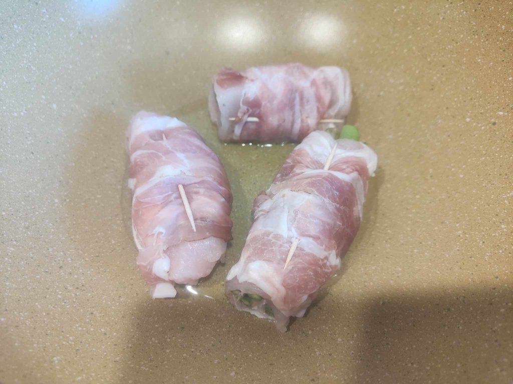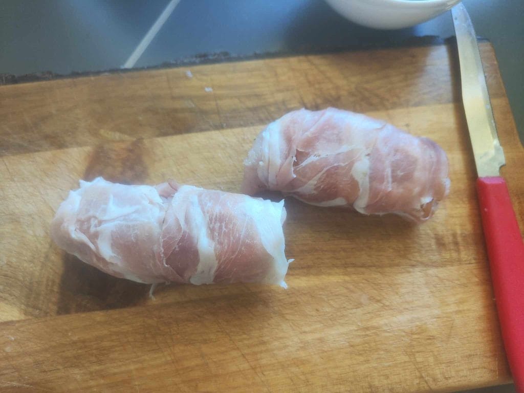 Enveloppez chaque roulade avec 1 à 2 tranches de speck, en les fermant avec des cure-dents.