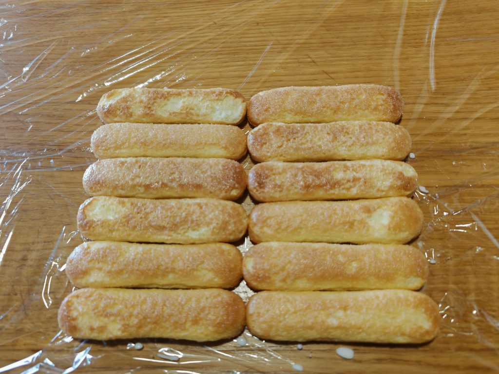 • Trempez les boudoirs dans le lait puis disposez-les sur une surface de travail recouverte de film. (faites attention à ne pas les imbiber trop).