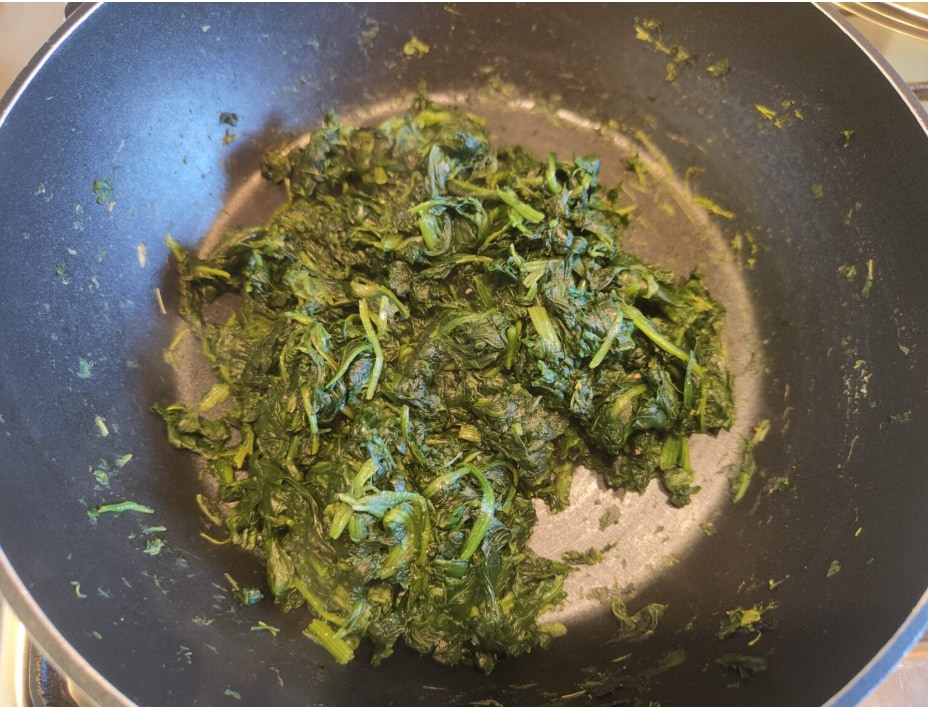 J’ai choisi les épinards parce qu’à la maison, ils les préfèrent, mais en alternative, vous pouvez utiliser les artichauts, les blettes, les feuilles de navet ou ces mélanges de légumes que l’on trouve dans tous les supermarchés, autant frais que surgelés.