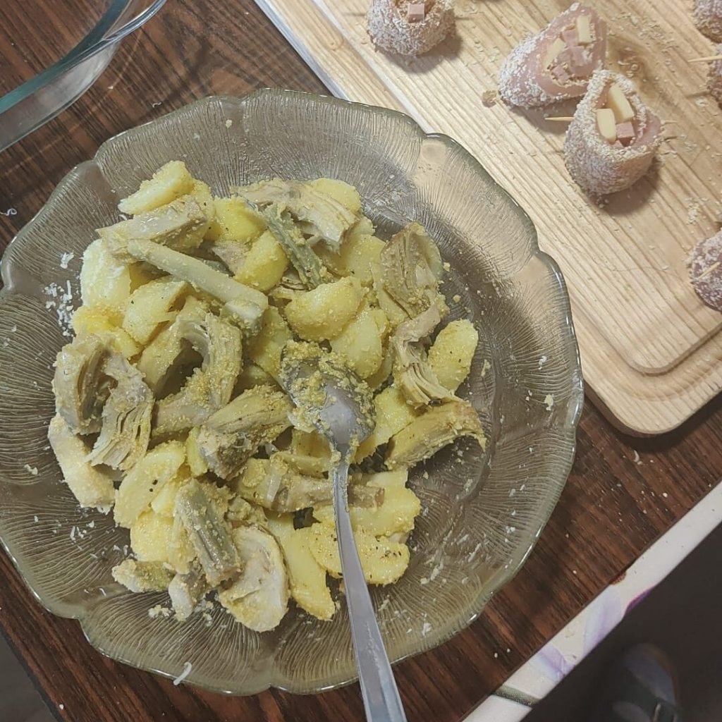 • Pendant ce temps, mettez les pommes de terre coupées et les artichauts coupés dans un bol, ajoutez la chapelure, le fromage râpé, le sel et le poivre, et mélangez.